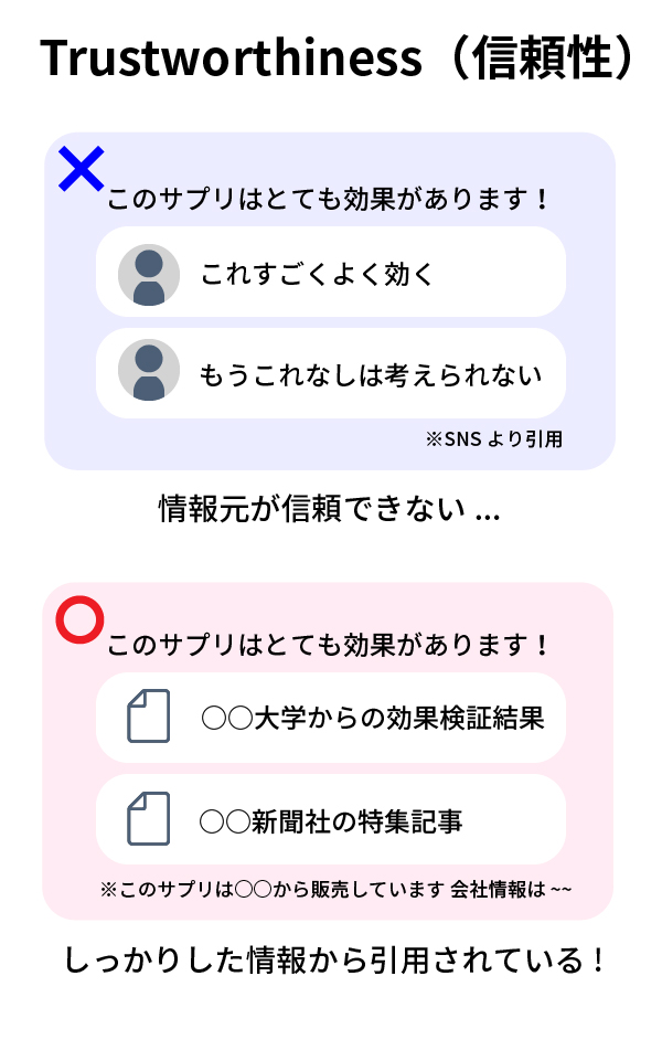 社会的に信頼性のある人物(医者等)が書いたレビューだと評価されやすいです。また匿名の方でもアンケートなどの多数の人間の評価だと信頼性が高くなります。